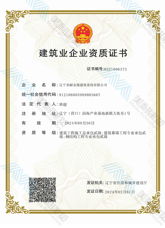 遼寧美耐金屬建筑系統(tǒng)有限公司位于遼寧(營(yíng)口)沿海產(chǎn)業(yè)基地,專(zhuān)注于預(yù)制金屬建筑系統(tǒng)領(lǐng)域,是一家集工業(yè)建筑設(shè)計(jì)、制作、施工及相關(guān)的技術(shù)咨詢與服務(wù)為一體的綜合性服務(wù)企業(yè)。作為國(guó)家鋼結(jié)構(gòu)協(xié)會(huì)會(huì)員、中國(guó)建筑金屬結(jié)構(gòu)協(xié)會(huì)會(huì)員單位與國(guó)家高新技術(shù)企業(yè),美耐建筑集建筑工程施工總承包、鋼結(jié)構(gòu)工程專(zhuān)業(yè)承包等多種資質(zhì)于一身,并擁有22項(xiàng)鋼結(jié)構(gòu)建筑領(lǐng)域?qū)@?項(xiàng)軟件著作權(quán)。